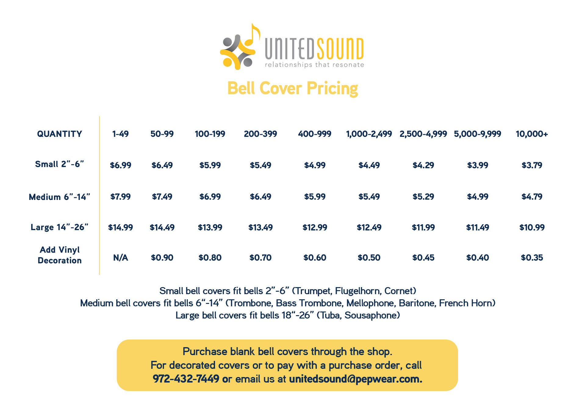 Customize your masks and bell covers! Add a logo, school mascot, or other design. Order turn-around is 3-4 weeks from the purchase date. Simply click the Request a Quote link below to get started.